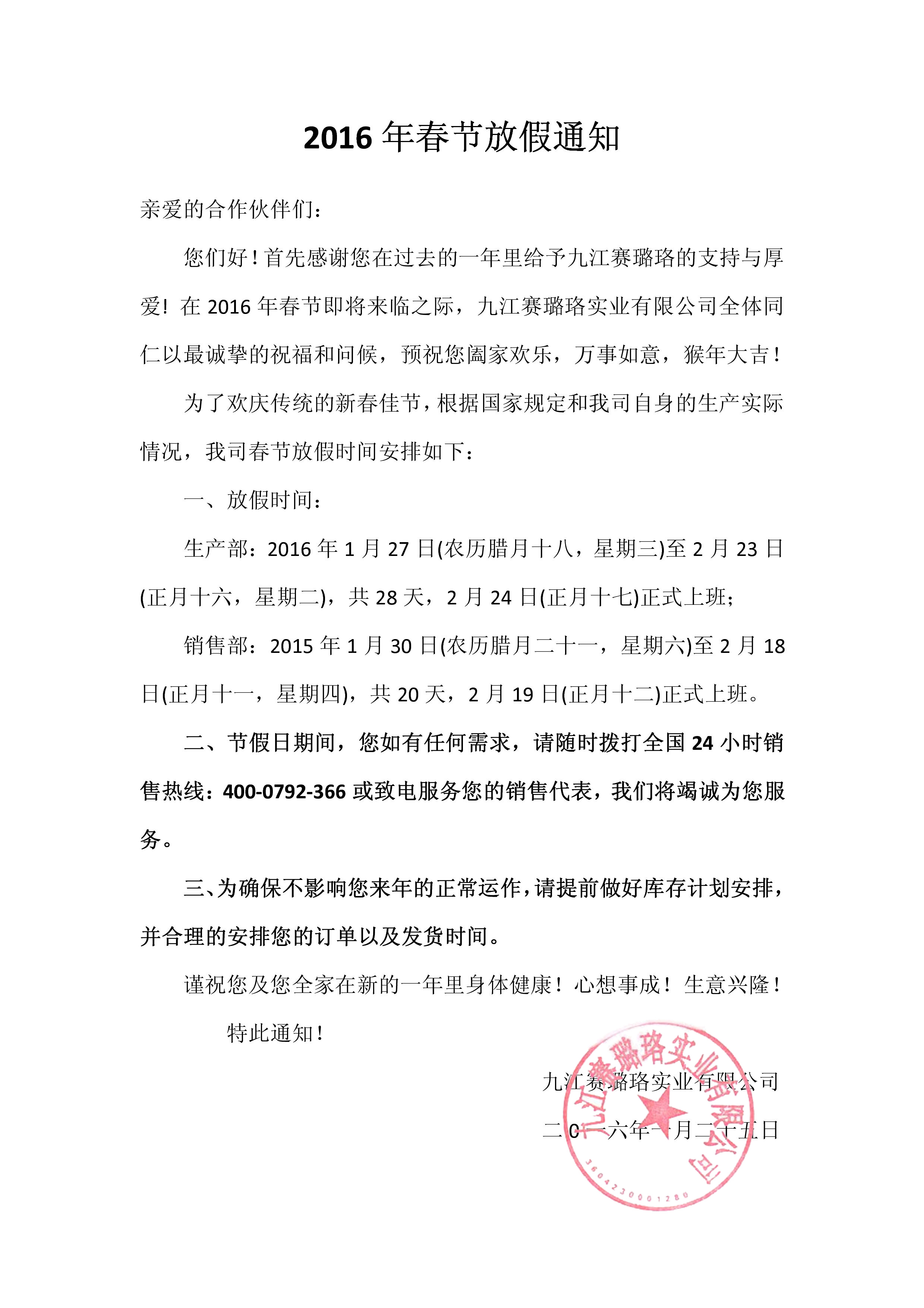 九江賽璐珞2016年春節放假通知