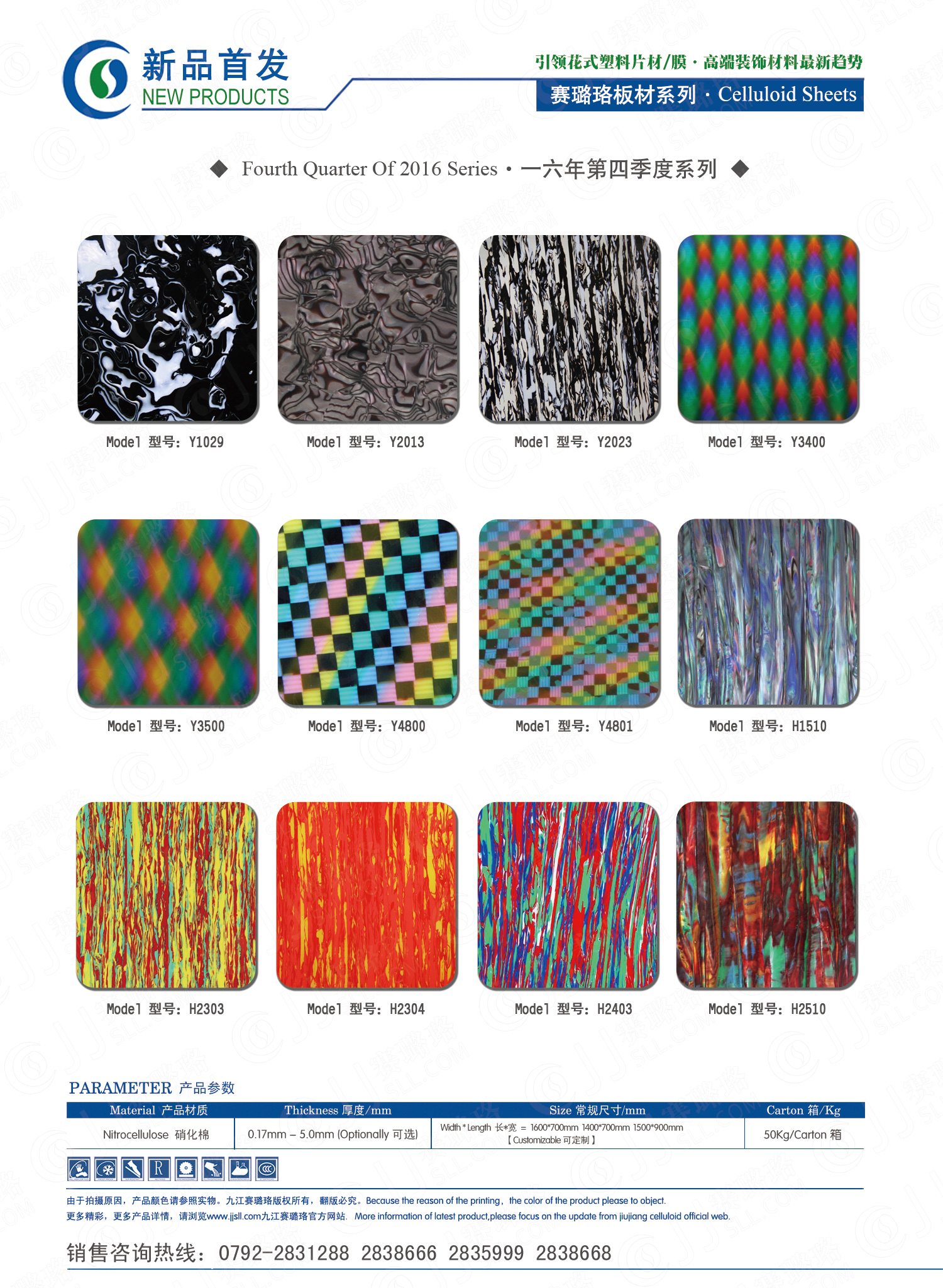 九江賽璐珞實業有限公司2016年十一月份賽璐珞板材、瑪瑙膜、理石膜、樂器裝飾材料、花式PVC片材新品發布,引領花式塑料片材/膜·高端裝飾材料最新趨勢。咨詢熱線:0792-2838668 / 2838666 / 2835999。點擊圖片查看詳細產品