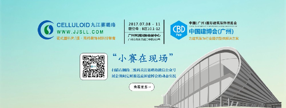 歡迎大家關注九江賽璐珞實業有限公司微信公眾號,我司將參加2017年廣州建博會。我們將持續為大家帶來建博會最新動態,更新時間為8號-11號。每天一更!